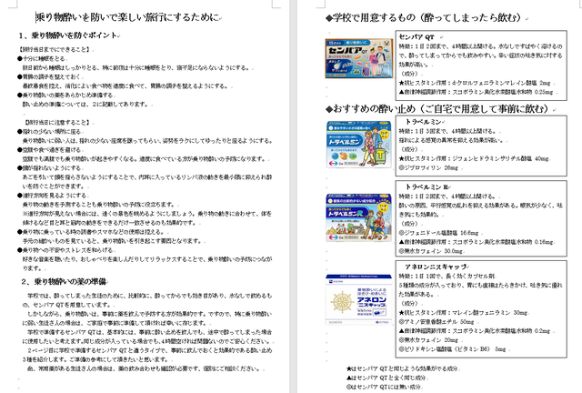 乗り物酔いしないため、事前に家庭でできることの指導、乗り物に乗っている間の注意事項などをまとめました。酔ってからでも効果が期待できる酔い止めを学校でも準備します。家庭でも事前に飲んで効果的な酔い止めを準備して頂くことを提案しました。